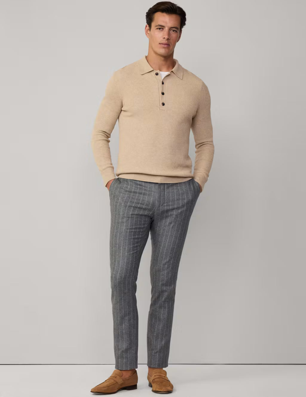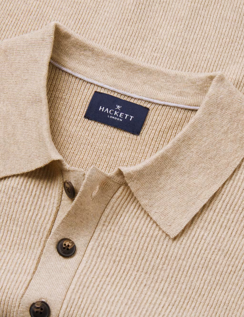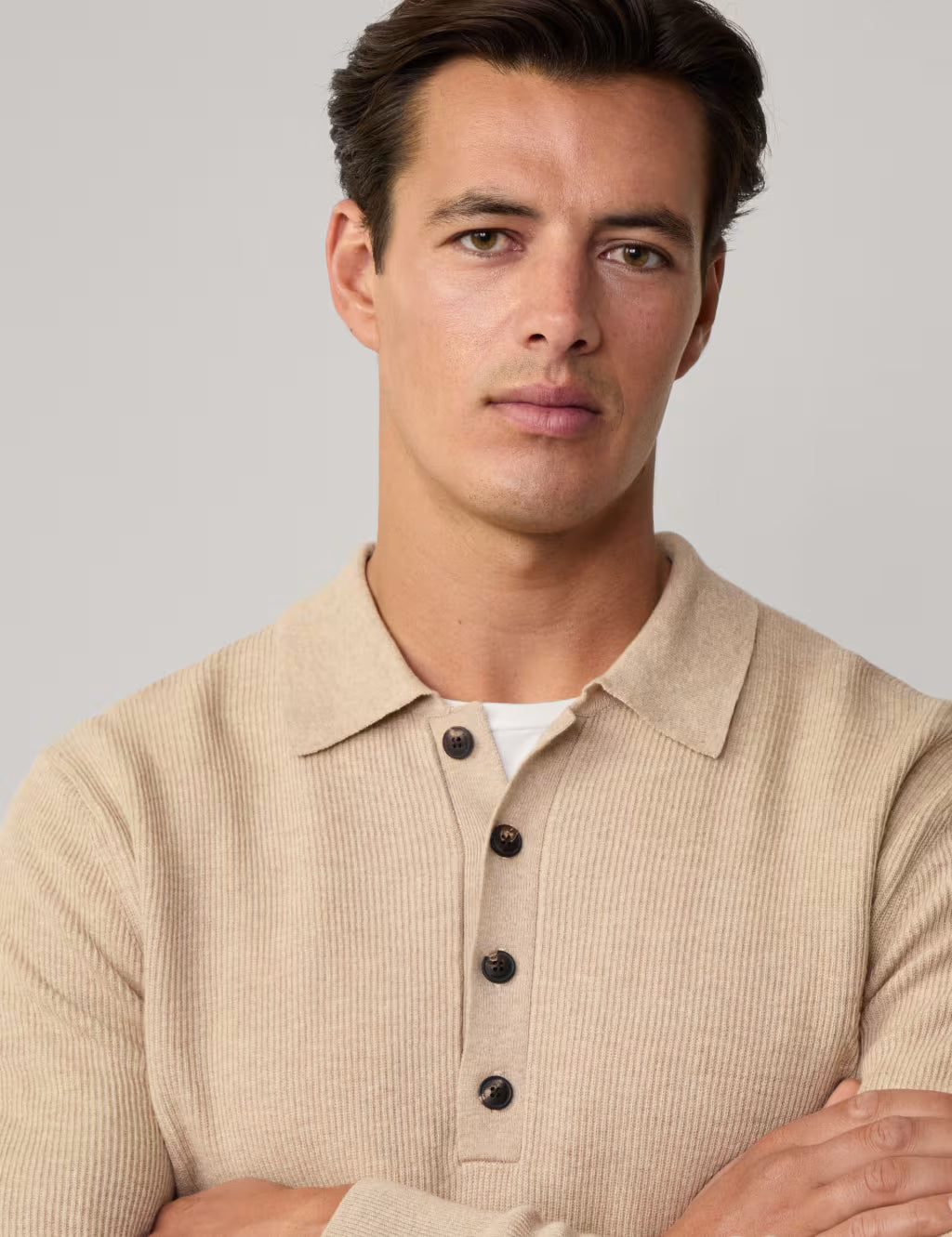 Este jersey veraniego tejido con medio botón está confeccionado en una lujosa mezcla de algodón y lana con punto acanalado. Presenta botones distintivos en contraste.